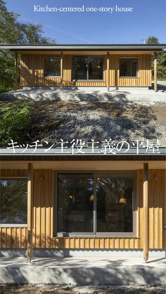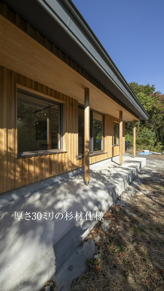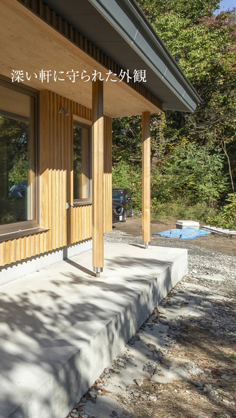 木張りが雑木林に映える。伸長した屋根を外柱で受け