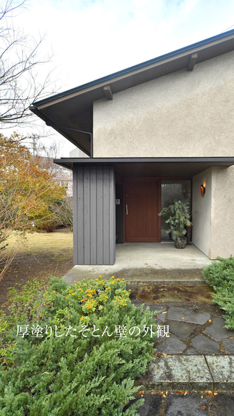 塗り壁に見える雨で生じた軒下との色の差が吸水力の証