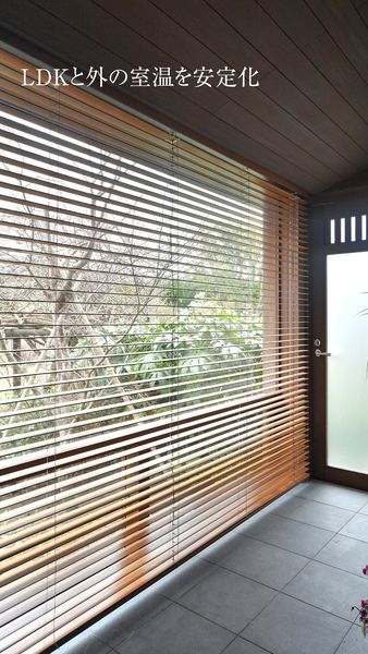 夏は軒と木製ブラインドによる日陰として機能する