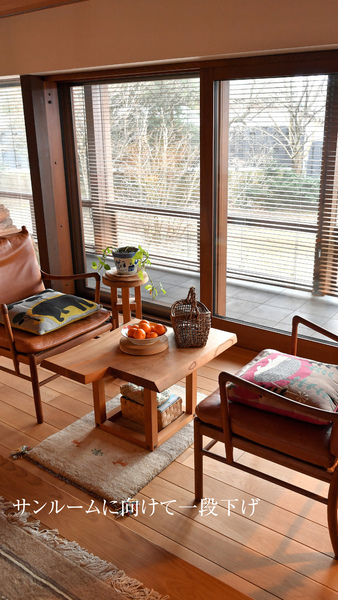 サンルームに向けて一段下げたスペースは段差が境目となり