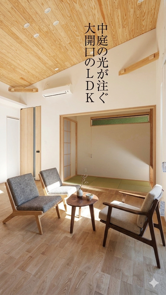 中庭を活かした大開口から光が注ぎ室内を優しく包み