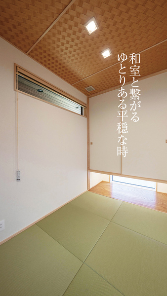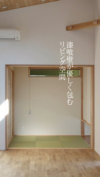 漆喰壁の質感がリビングを包み、隣り合う和室と調和します