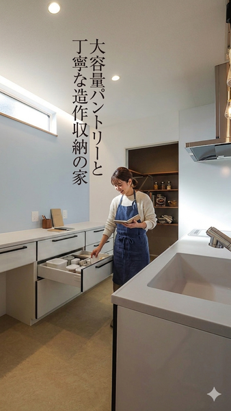 会話が弾む対面キッチンと大容量の造作パントリーを設置