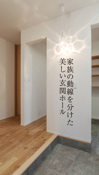 視線を遮る通路の先にある玄関は家族のプライバシーを守り