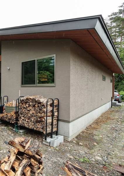玄関はスギ羽目板の壁で目隠し、シンプ