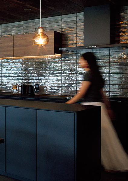 ウォールナットの床に、壁面タイルのグ