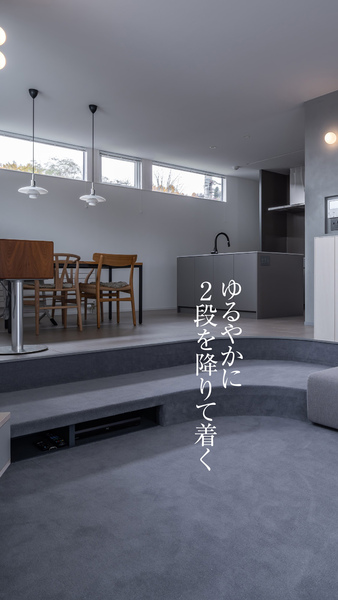 抜け、段差を設けた造作ソファなど