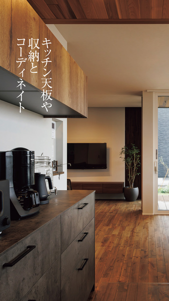 キッチン天板、収納、天井のレッドシダーを落ち着いた