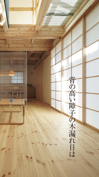 天井高の障子や吹き抜けから光が注ぐリビング無垢材など