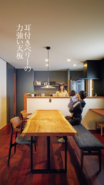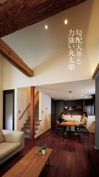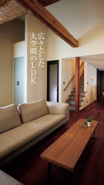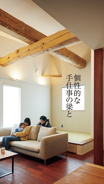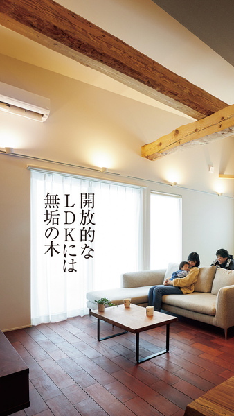 直線が際立つ大空間に手仕事の梁が伸びる無垢の住まい