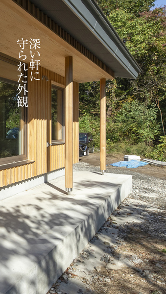 木張りが雑木林に映える。伸長した屋根を外柱で受け