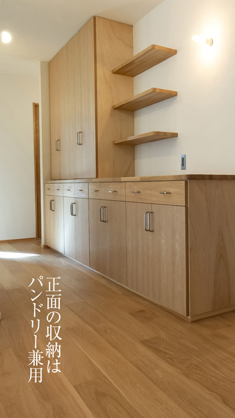 正面の廊下収納はパントリーを兼ねる。